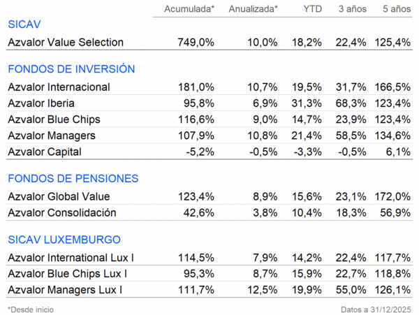 Azvalor es una firma de gestión de activos independiente, con 3.600 millones de euros bajo gestión y 30.000 inversores, que invierte bajo los principios del «value investing», con un equipo con más de 25 años de experiencia.