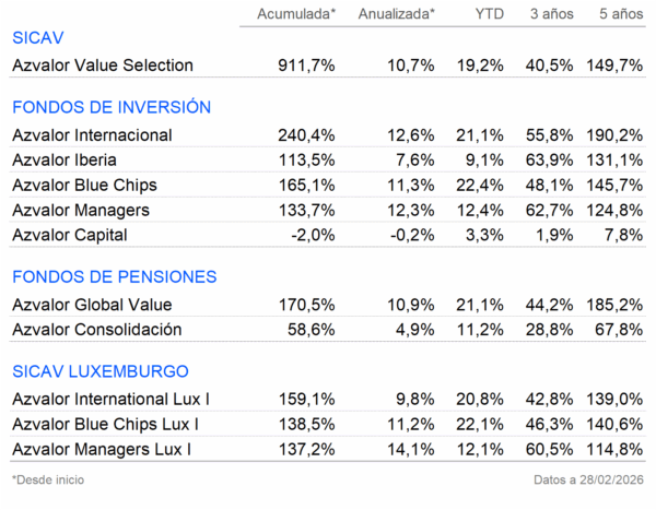 Azvalor es una firma de gestión de activos independiente, con 4.000 millones de euros bajo gestión y más de 30.000 inversores, que invierte bajo los principios del «value investing», con un equipo con más de 25 años de experiencia.